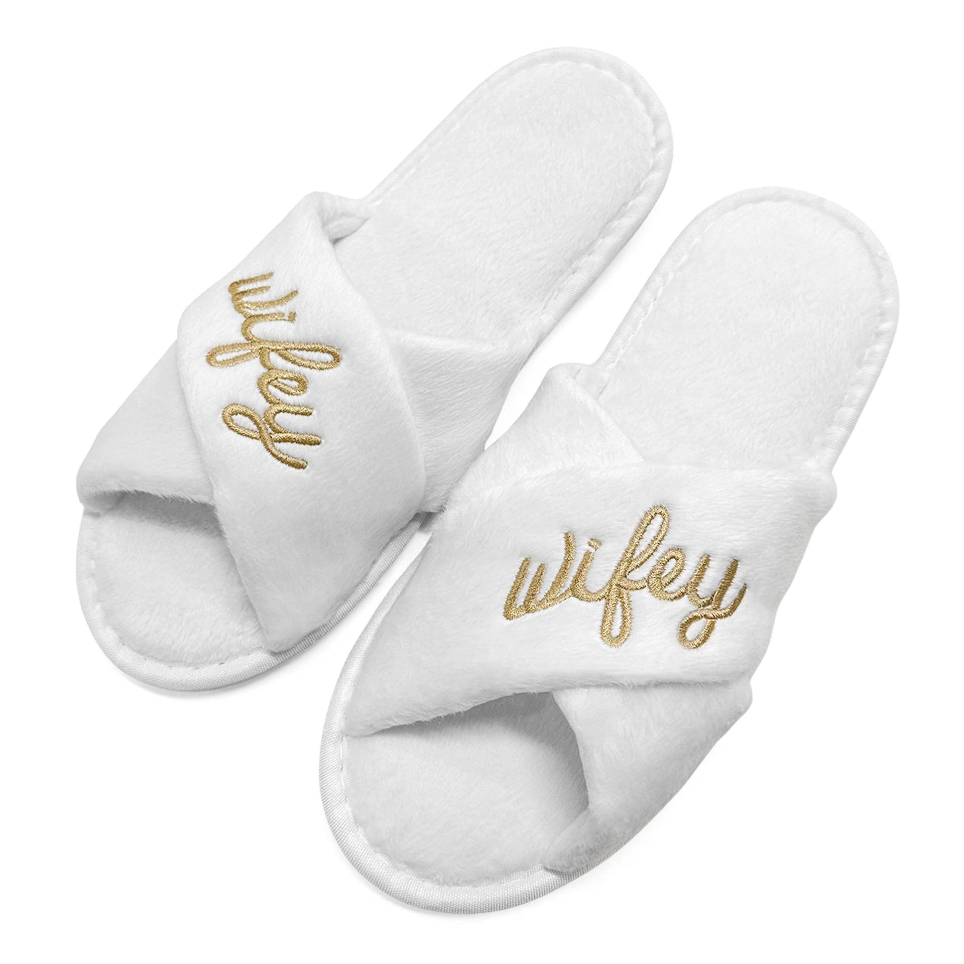 Step into your wedding morning in comfort and style with these luxury white bridal slippers, designed especially for the bride, bridesmaids and her bridal party. Made from soft plush material and finished with gold embroidered text, they’re a beautiful blend of elegance and practicality.